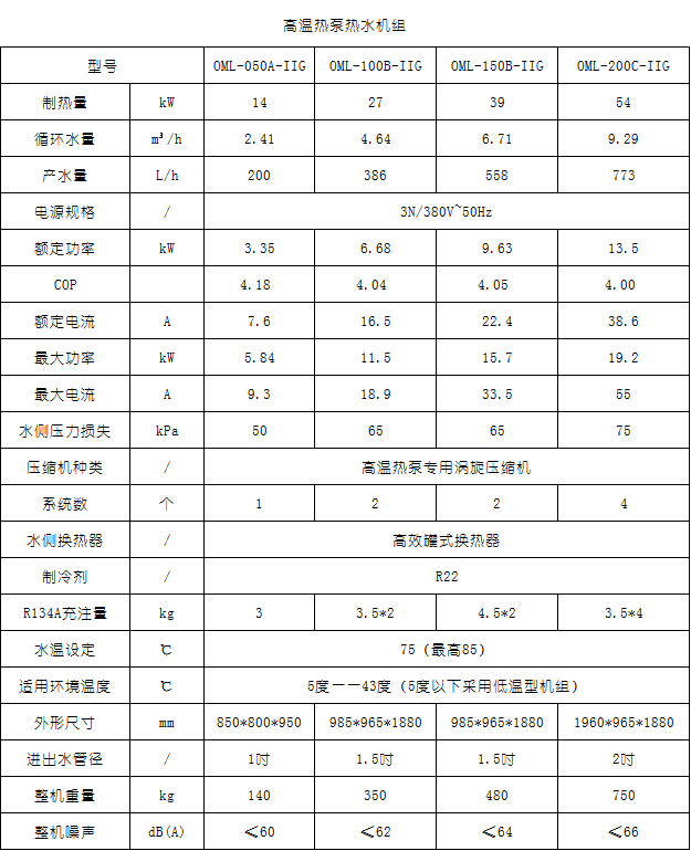 采用卡諾循環原理,電能驅動,以制冷劑為吸熱體,從空氣中吸收熱量制取熱水。采用進口品牌壓縮機,引進美國第五代雙螺旋殼管式熱交換器,吸收環境中的熱量,水電分離,。熱泵定位:低溫環境熱泵(北方)、常規熱泵、中溫熱泵、高溫熱泵。目前市場上80%的熱泵都是常規熱泵,出熱水溫度55度,宿舍樓生活用熱水安裝較普遍;中溫熱泵近幾年推廣多用于工業熱水,出熱水溫度不高于80度,這兩款基本滿足取暖、烘干、洗滌、醫藥、化工、布染固色、農業、澡堂、實驗室、恒溫室,且投資性價比高,用戶容易接受。生產設計工藝:除了常規和中溫熱泵用一級壓縮機工作原理,低溫和高溫的熱泵必須采用二級變頻壓縮機、熱能回收、壓縮機機械能轉換等工作原理。常規和中溫熱泵依靠空氣中熱能的制熱。而低溫和高溫熱泵是依靠空氣能制熱60%,壓縮機機械能轉換熱能10%,熱能回收30%.所以二級高溫熱泵受空氣能影響不像一級壓縮機動力系統那么大。