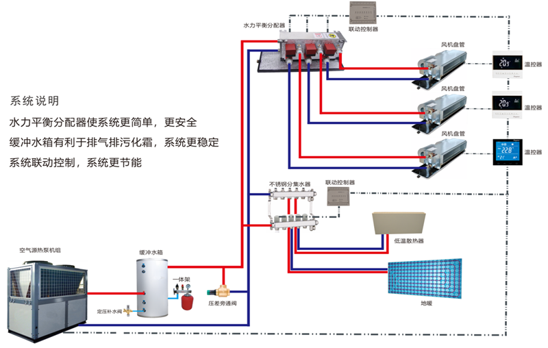 功能要求:配置風冷模塊機組實現夏季制冷、冬季供暖。末端采用風機盤管水系統。地暖熱泵實現冬天供暖。