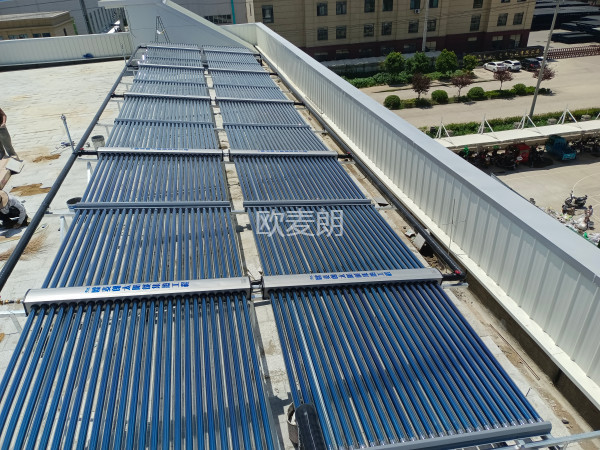項目配置:10組太陽能集熱模塊+歐麥朗空氣能熱泵熱水機組+圓形水箱
