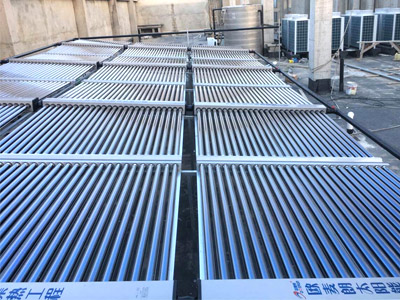 日供熱水:12組集熱真空管模塊+2臺歐麥朗5p空氣能熱泵機組+6噸保溫水箱