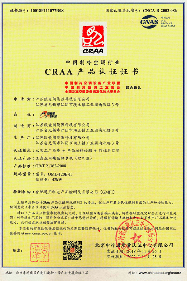 • 中國制冷空調行業CRAA產品認證證書