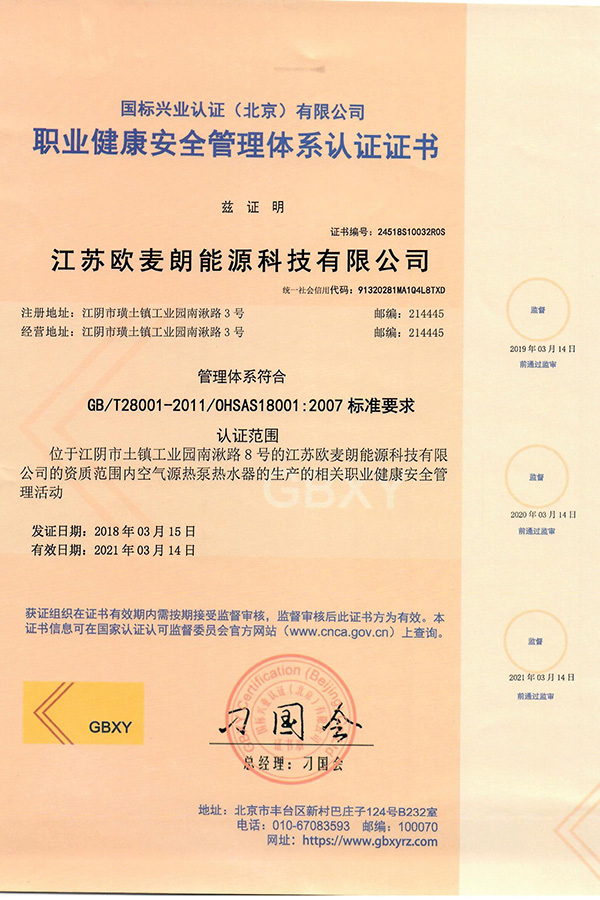 • 職業健康安全管理體系認證證書