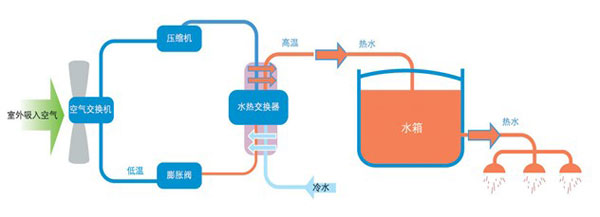 空氣源熱泵中央熱水機組是繼熱水鍋爐、燃氣熱水器、電熱水器和太陽能熱水器之后的新一代熱水制取裝置;它突破傳統熱水設備的工作原理,創造性地將熱泵原理應用到機組上,利用壓縮機驅動制冷工質進行逆卡諾循環,從室外空氣中吸取熱量產生高品質的熱水,滿足人們生活、生產的需要;空氣源熱泵熱水機組已廣泛的應用在社會的各行各業。從政府機關到學校、醫院,從酒店、賓館到別墅、住宅小區,隨處可見熱水機組的“身影”;利用空調制熱的原理制取生活熱水,不僅將電能轉換給熱水,還可以吸收空氣中熱能,效率高達460%。