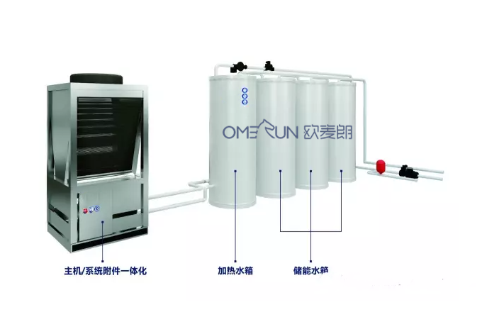 系統根據制冷壓縮機作功,空氣中能源遷移至水里,制冷劑不斷循環系統,熱泵機組持續消化吸收能源,根據冷卻器開展率傳熱,將能源傳送至封閉式水箱中;根據內部流水循環系統,將每一個控制模塊承壓水箱填滿熱水。