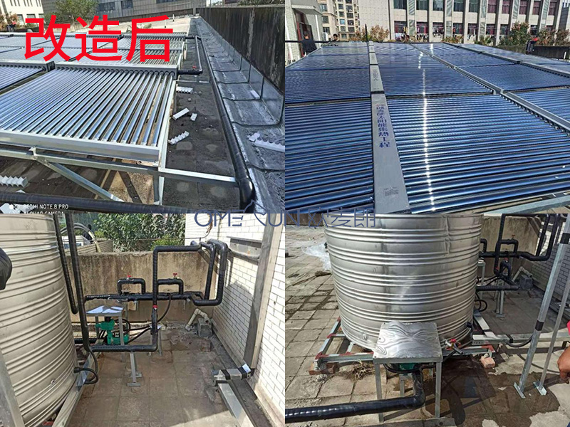 目前整套系統運行下來,效果非常顯著,故障率明顯比之前低很多,哪怕是天氣再冷,也沒出現太陽能管被凍壞,用空氣源熱泵代替電加熱,全年下來,電費也節省了將近一半,符合節能環保綠色時尚的理念,推動了太陽能和空氣能在安徽地區的使用。