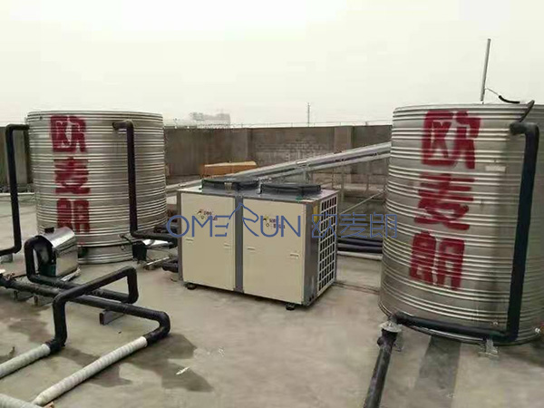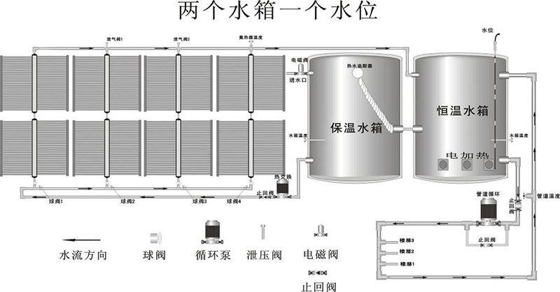 設備配置:一臺空氣源熱泵+多組太陽能集熱器+集熱水箱+保溫水箱