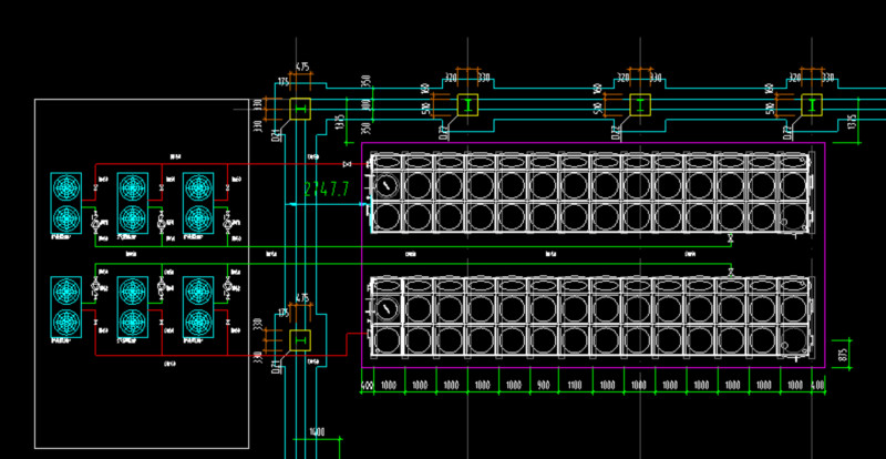我們根據當地的氣候情況,再根據13個公寓,兩個食堂的熱水需求量,來配置了6臺空氣源熱泵和兩個水箱,加上循環泵等。如下圖: