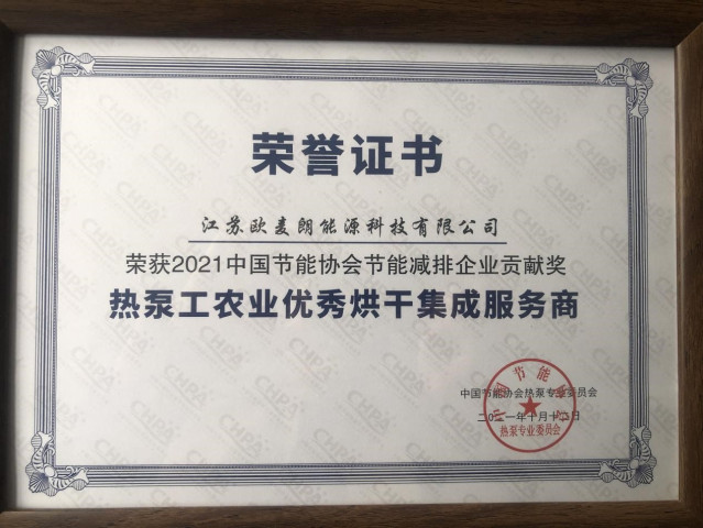 為表彰和獎(jiǎng)勵(lì)在我國熱泵應(yīng)用及研究領(lǐng)域做出突出貢獻(xiàn)的組織和個(gè)人,推動(dòng)熱泵技術(shù)進(jìn)步,促進(jìn)產(chǎn)品市場應(yīng)用,弘揚(yáng)節(jié)能減排國策,助推可再生能源發(fā)展,樹立行業(yè)品牌標(biāo)桿,中國節(jié)能協(xié)會(huì)熱泵專業(yè)委員會(huì)組織開展了“2021中國節(jié)能協(xié)會(huì)創(chuàng)新獎(jiǎng)熱泵行業(yè)節(jié)能減排科技進(jìn)步獎(jiǎng)和節(jié)能減排貢獻(xiàn)獎(jiǎng)”評(píng)選活動(dòng),歐麥朗憑借一流的研發(fā)水平、高效的系統(tǒng)集成能力、以及完善的售后服務(wù)體系,榮獲“熱泵工農(nóng)業(yè)優(yōu)秀烘干服務(wù)集成商”殊榮,這是對(duì)歐麥朗在烘干領(lǐng)域深耕多年成績的充分認(rèn)可和嘉獎(jiǎng),也必將激勵(lì)我們?cè)诋a(chǎn)品、技術(shù)、服務(wù)上再接再厲,永攀高峰,為國家節(jié)能減排的目標(biāo)繼續(xù)做出貢獻(xiàn)!
