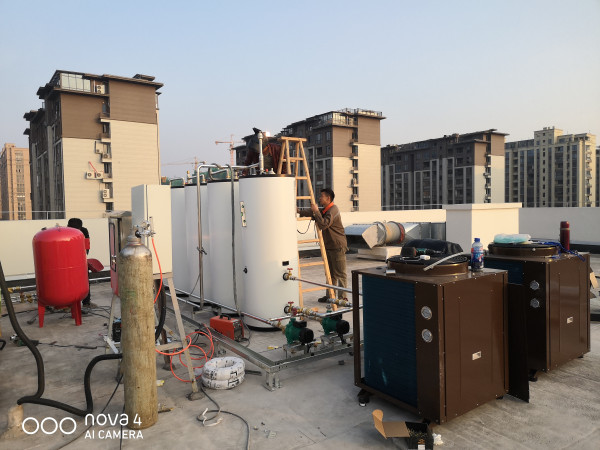 系統配置了5臺承壓儲熱水罐+2臺歐麥空氣能熱泵+歐麥朗自主研發的智能控制。