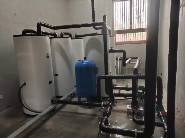 系統配置:采用一臺空氣源機組,一個455L電加熱水箱、4個455L儲水箱配置而成。整個系統承壓出水,系統穩定性高。
