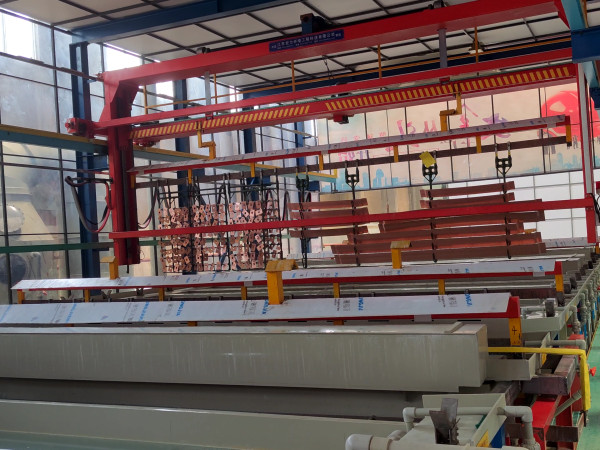 連續電鍍又稱卷對卷電鍍,素材一般是帶狀可以卷起來的,如鋼帶,連續沖壓后的產品。電鍍流程經放料--前處理--電鍍--后處理--烘干--收料組成。每個電鍍槽一般分為母槽和子槽,藥水從母槽中用泵打入子槽中,子槽兩邊有縫隙,要鍍的料從縫隙中穿過,打入子槽的藥水也從縫隙中流出而流入母槽。