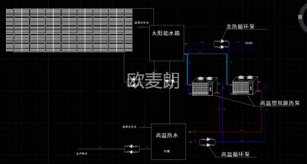 歐麥朗致力研發(fā)工業(yè)節(jié)能降耗方案。公司生產產品包括:太陽能、空氣能、水源熱泵、雙源熱泵等。經過多年節(jié)能工程的技術積累,研發(fā)出最新的高溫熱水解決方案,太陽能與雙源熱泵的結合,大大的節(jié)省了高溫熱水的能源成本。下面就為大家介紹我們的太陽能+雙源熱泵方案。