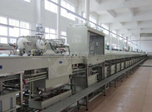連續電鍍又稱卷對卷電鍍,素材一般是帶狀可以卷起來的,如鋼帶,連續沖壓后的產品。電鍍流程由放料→前處理→電鍍→后處理→烘干→收料組成。每個電鍍槽一般分為母槽和子槽,藥水從母槽中用泵打入子槽中,子槽兩邊有縫隙,要鍍的料從縫隙中穿過,打入子槽的藥水也從縫隙中流出而流入母槽,由于流入流出的速度有差異,就可以保持一定的液位。溫度要求一般在55-60℃。