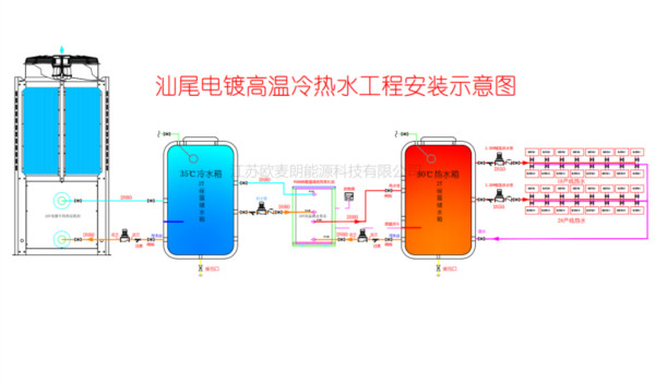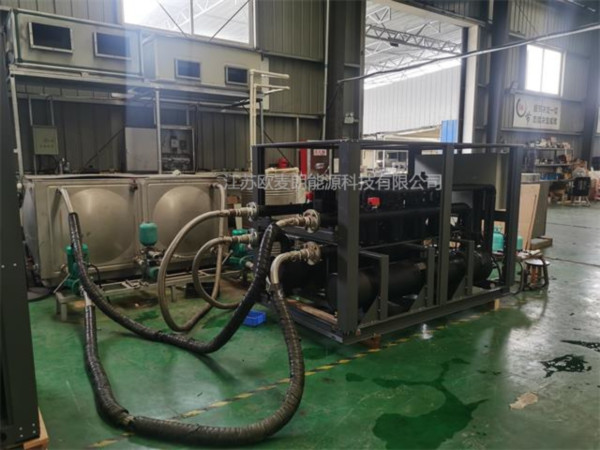 此次定制的50匹高溫水源熱泵機組是為廣東汕尾電鍍廠加熱恒溫系統配套使用,客戶要求加熱溫度80度,歐麥朗工程師設計采用分體式復疊(雙級耦合)高溫熱泵加熱系統。第壹級配置一臺50匹空氣源熱泵機和一只2噸的保溫低溫水箱,將水箱溫度維持在35-40度。第二級配置定制的50匹高溫水源熱泵機組和一只2噸的保溫高溫水箱,將水箱溫度維持在80-85度。空氣源熱泵加熱的低溫水箱作為高溫水源熱泵的熱源,加熱2噸高溫水箱。達到蕞大化的節能效果。
