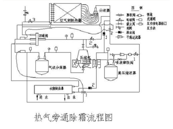 當進入除霜程序時,機組仍保持制熱工作循環,在壓縮機的排氣側分出一股高溫氣體進入需要除霜的空氣側換熱器,使高溫氣體在高于 5℃發生相變放出潛熱達到除霜目的(見以上熱氣旁通除霜狀態圖)。除霜后的制冷劑液體進入另外一側正常制熱的換熱器繼續蒸發,這樣,這部分制冷劑仍發揮了制熱的功效,蒸發后變為氣體避免了壓縮機因除霜造成的回液可能。若因某種原因造成除霜不停止時,高溫氣體不直接回到壓縮機,而是進入另外一側正常制熱的換熱器,此時制熱膨脹閥將會根據過熱度的變化自動增加供液量,從而使壓縮機的吸氣保持在合適的過熱度范圍內。在整個除霜過程中,由于避免了機組制冷循環和制熱循環的相互轉換,壓縮機的吸、排氣狀態基本保持穩定。以上就是歐麥朗熱氣旁通除霜技術。