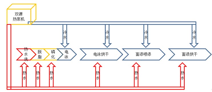 汽車生產(chǎn)制造過程包含沖壓、焊接、涂裝和總裝四個(gè)工藝過程,其中涂裝之前,先要進(jìn)行表面處理,主要目的是清除車身表面的油污、塵土、銹蝕等。完整的表面處理工藝是:預(yù)脫脂→脫脂→熱水洗→冷水洗→酸洗→冷水洗→磷化→冷水洗→表面調(diào)整→電泳→冷水洗→熱水洗→純水洗→干燥。至今工序中常規(guī)加熱、冷卻能源幾乎都是燃?xì)庵苯蛹訜嵴羝ǜ邏簾崴厮┖屠鋬鰴C(jī)冷水。各需求之間獨(dú)立處理,沒有做能源回收再利用的整合處理,造成能源浪費(fèi),單產(chǎn)能耗高等問題。