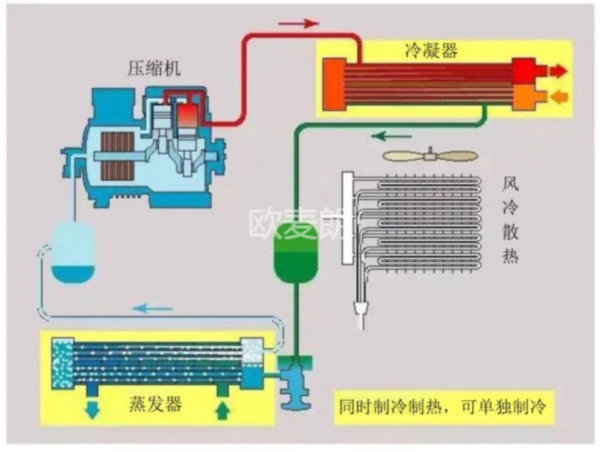 近年來,歐麥朗也緊跟時代步伐,從事研究雙源熱泵多年,做到制冷的同時能制熱,制熱的同時也能冷,下面我們簡單介紹下多源制冷熱回收及水源高溫的搭配。