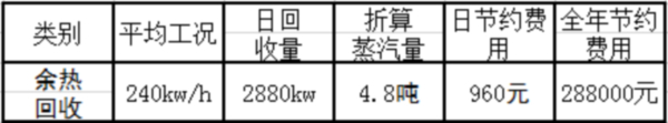 運(yùn)行費(fèi)用:單臺設(shè)備每小時回收熱值Q≈1.2*△t*N=1.2*60*10000≈200kW,實(shí)際使用過程中熱交換損失折扣按60%計(jì)算,熱值約為120KW。1噸蒸汽的熱值約為600kW,即單臺設(shè)備每小時可以節(jié)約0.2噸蒸汽。本項(xiàng)目設(shè)計(jì)全年300天運(yùn)行,每天運(yùn)行12小時,每臺成型機(jī)配備2臺余熱回收器,蒸汽按臨清本地價格200元/噸計(jì)算。本項(xiàng)目年運(yùn)行費(fèi)用估算如下。