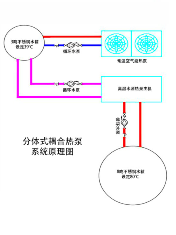具體的耦合方式為:空氣能熱泵加熱3噸水箱,將水箱溫度維持在20-30℃提供低位能源,由水源熱泵二次提溫到80℃。此系統不但可以滿足需求,而且能源消耗低,后期的運行成本也節省,還可以實現整個系統全自動化運行。