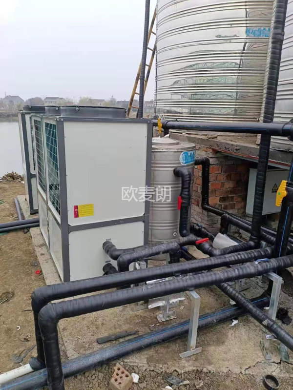 目前水產養殖恒溫是關鍵,在湖州魚目匯鱸魚養殖基地,現有育苗池20個,每個池子6立方,需要恒溫在26℃。我們歐麥朗根據實際養殖育苗情況,配置兩臺15匹恒溫熱泵機組,為其提供冬季鱸魚育苗恒溫保障。設有2個圓形不銹鋼保溫水箱,一個為加熱水箱,一個為恒溫水箱。一臺15匹恒溫熱泵用來加熱,另一臺15匹恒溫熱泵用來恒溫。此套系統采用半自動恒溫,池子里面做換熱管,不需要做溫控,在節省投資的情況下,又能滿足恒溫要求。