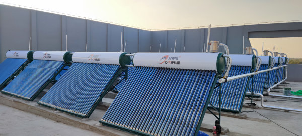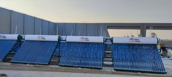 系統(tǒng)配置72組太陽能,2只30噸保溫水箱,一個(gè)太陽能集熱水箱,一個(gè)供熱水箱,在晴好天氣時(shí),太陽能對集熱水箱加熱,使集熱水箱內(nèi)的水溫升高;再通過水泵打到供熱水箱,存儲熱水,由供熱水箱直供給鍋爐加熱。