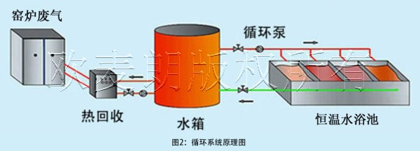 一是將廢氣換熱產生的高溫熱水一部分輸送到其他生產線上用于生產,只留一部分用于恒溫池加熱,這個方案需要制備一個蓄熱水箱,用來儲備換熱器制取的熱水,熱水箱做兩路循環一路做為水池恒溫用,另一路作為生產車間使用。