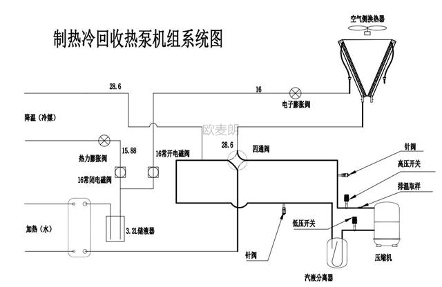 制熱冷回收熱泵機組是一種利用熱泵技術,將制熱和制冷相結合的新型設備。它的工作原理是:通過壓縮機將制冷劑壓縮成高溫高壓氣體,然后經過冷凝器將熱量傳遞給冷水,制取熱水;同時,制冷劑經過膨脹閥降壓后,變成低溫低壓氣體,再經過蒸發器吸收空氣中的熱量,使空氣溫度降低,從而起到降溫效果。