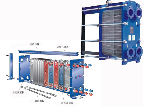 可拆卸板式換熱器是由許多沖壓有波紋薄板按一定間隔,四周通過墊片密封,并用框架和壓縮螺釘重疊而成。板和墊片的四個角孔構(gòu)成了流體分配器和集液管。同時,冷流體和熱流體被合理地分離,以便它們在每個板的兩側(cè)被分離。在通道中流動,通過板進行熱交換。